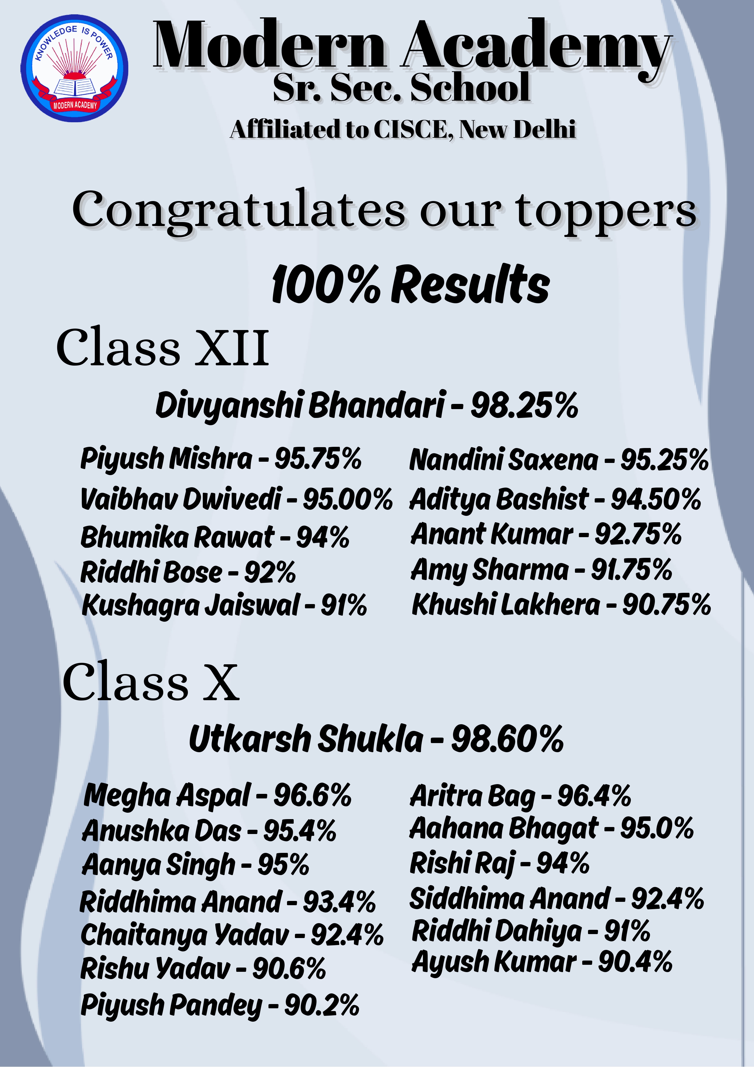 Modern Academy is an English medium co-educational 10+2 school, situated at Indirapuram on Delhi Hapur Highway. The ICSE result of the first and second batches of the students were 100% with full first divisions. The school is affiliated to the Council for Indian School Certificate Examination, New Delhi (C.I.S.C.E.), which is parallel to CBSE, New Delhi. The C.I.S.C.E. is committed to serving the nation’s children, through high quality educational endeavours, empowering them to contribute towards a humane, just and pluralistic society, promoting introspective living, by creating exciting opportunities, with a commitment to excellence.